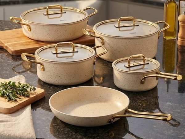 Falez Premium 9-Piece Granite Non-Stick Cookware Set – Creamy & Gold Edition (Made in Turkey) (ON 01)