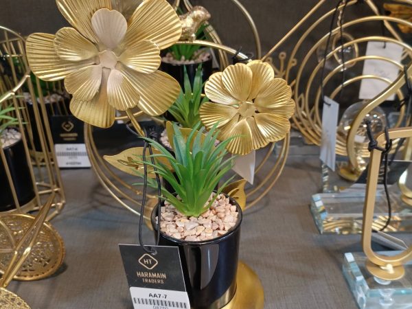 Artificial Succulent Plant With Gold-Colored Metal Flowers In A Black & Gold Cycle Pot.